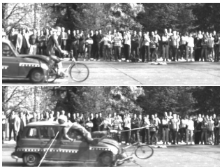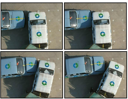 Here we see an example of Virtual CRASH 2.2 used to reconstruct real world collision between a station wagon and a motorcycle. The accident was captured on video. Excellent agreement is observed between the video and simulation (courtesy of engineer Sarkozi Tamas of Hungary).