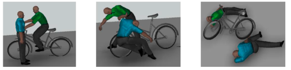 Abstract: Bicyclists and pedestrians are two large vulnerable groups of road users. Many cities have allowed cyclists to share space with pedestrians on footpaths and off-road paths to reduce conflict with motor vehicles. The risk of bicyclist-pedestrian accidents is also increasing accordingly. Therefore, there is a need to understand the factors that affect the risk of injury in such accidents, especially to pedestrians who are considered more vulnerable. This paper presents a detailed investigation of bicyclist-pedestrian collisions and possible injury outcomes. The study has considered five levels of collision speed ranging from 10 km/h to 30 km/h, three pedestrian profiles (adult, child, and elderly) differentiated by their weight and height, three bicycles with different masses, and five impact directions. The bicyclist-pedestrian collision simulations have been analyzed based on four metrics: throw distance, peak head velocity on impact with the ground, head injury criterion (HIC) value, and the probability of severe head injury. For each simulation, the throw distance and peak head velocity on impact with the ground are extracted. Following that, the HIC and the probability of severe head injury to pedestrians are computed. The results show a significant effect of collision speed (p < 0.05) on all four metrics. The analysis has been further extended to study the effect of height and weight profile, bicycle mass, and impact directions on bicyclistpedestrian collisions. According to the results, the impact directions largely influence the outcome of bicyclepedestrian collisions. In general, direct impacts on pedestrian body center have been found to yield higher HIC values and probability of severe head injury to pedestrians than off-center impacts. Also, video analysis of simulated collisions has suggested that the accident mechanism depends on weight and height profiles (correlated with different age groups) and impact directions. Finally, recommendations have been proposed based on the study, including a speed limit of not more than 12 km/h for bicyclists on narrow shared paths and footpaths where risks of collisions with pedestrians are high. The results and analysis presented could be helpful for developing legislation to minimize conflicts between bicyclists and pedestrians on shared paths and to reduce potential injury to pedestrians.