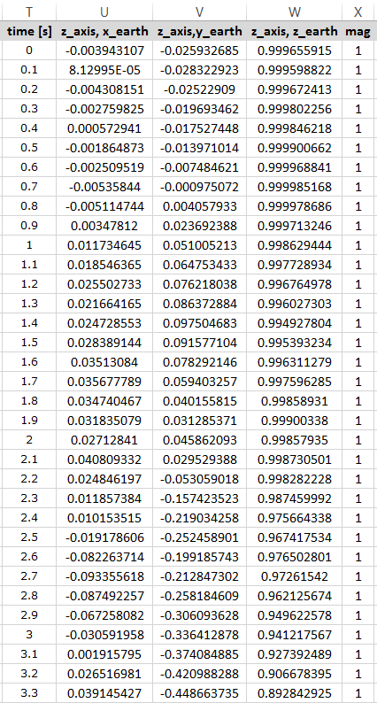time (seconds), x (ft), y (ft), z (ft), roll (degrees), pitch (degrees), yaw (degrees), Vx, Vy, Vz