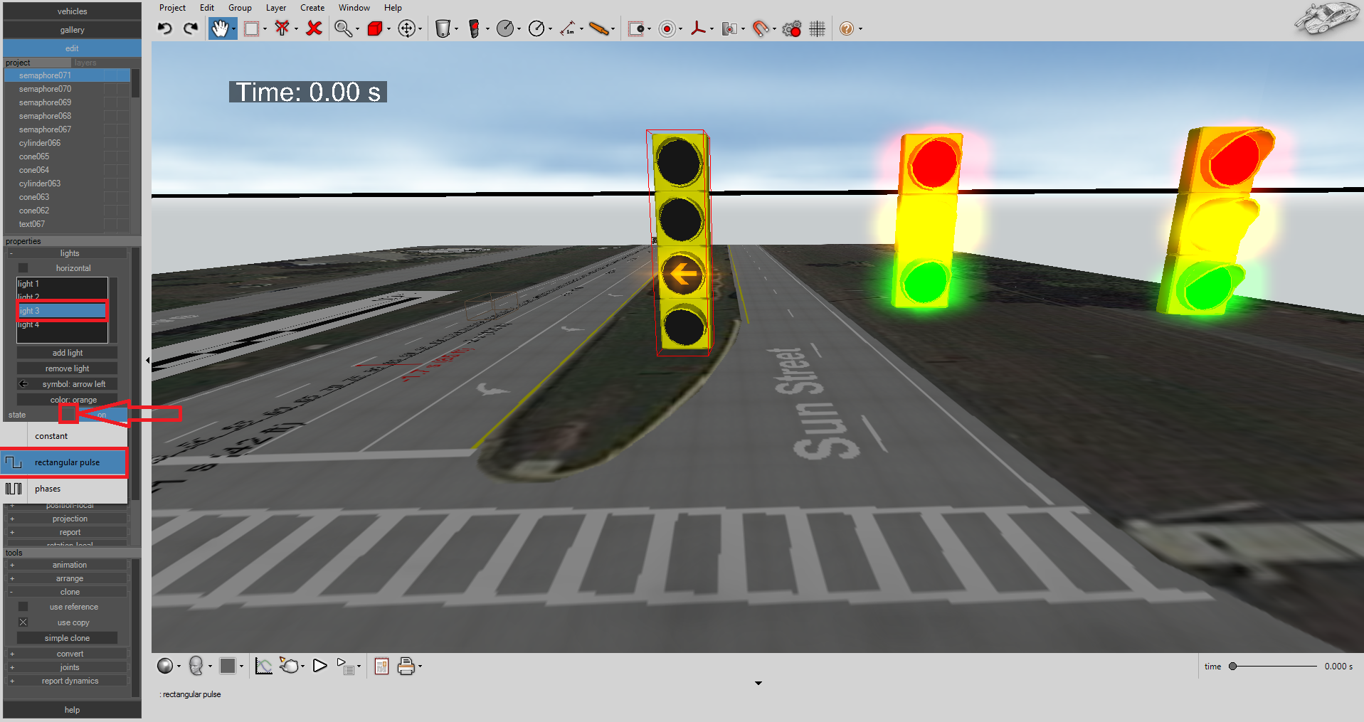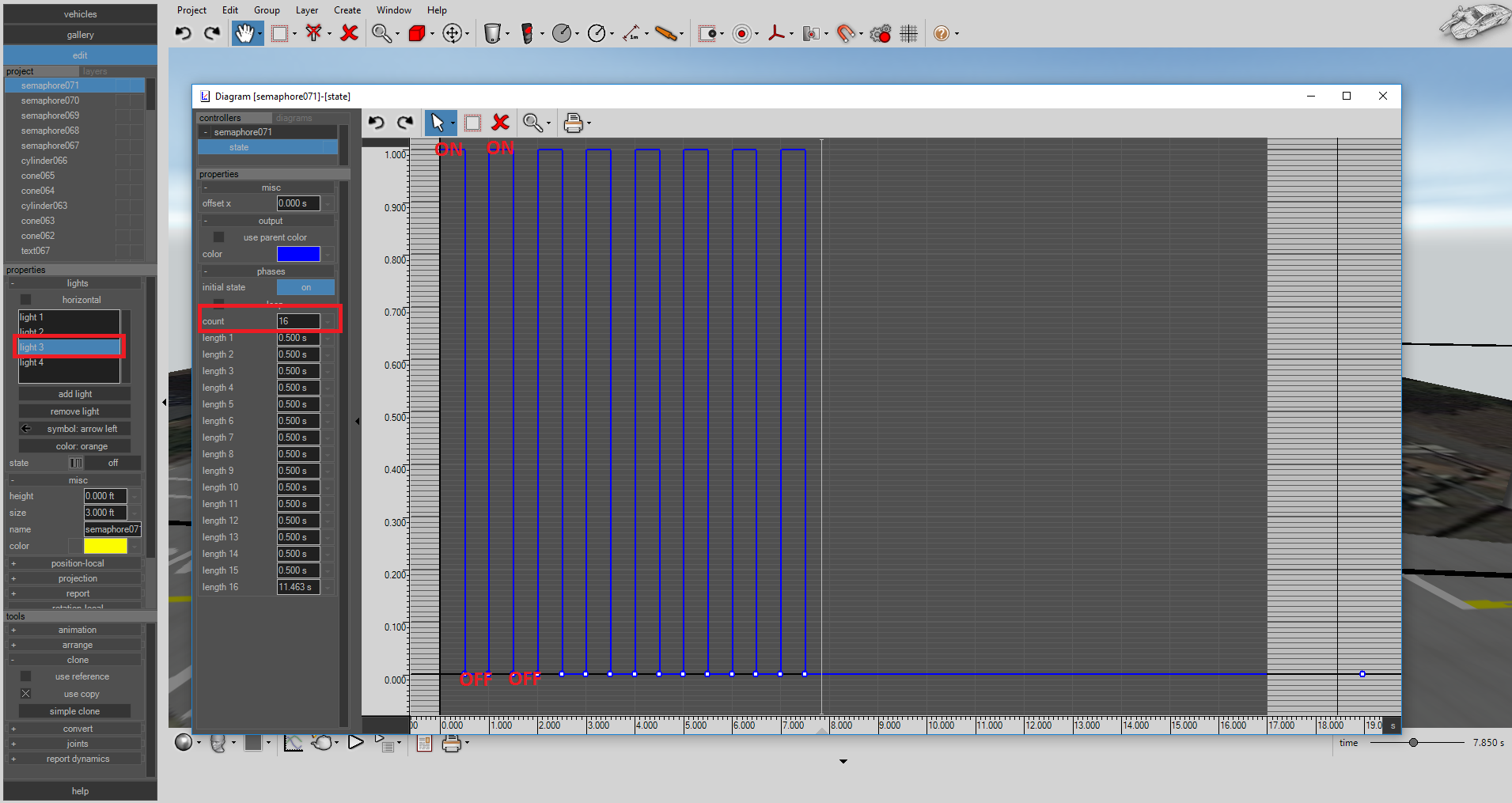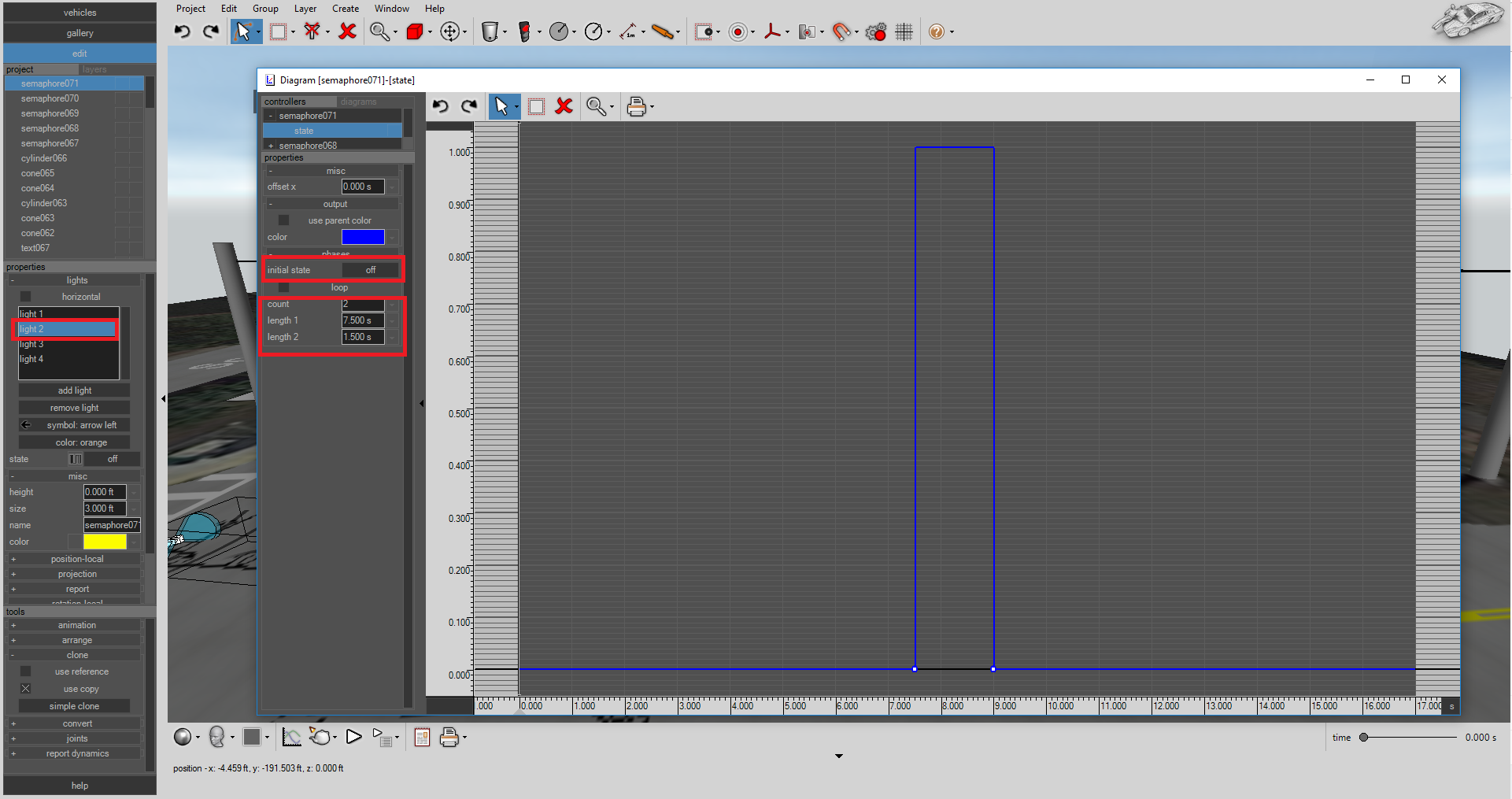 Next, using ctrl+left-click, we select both lights for the through-lanes. Again, we use the rectangular pulse option to go from the initial green ball on state to the off state at time = 7.5 seconds.