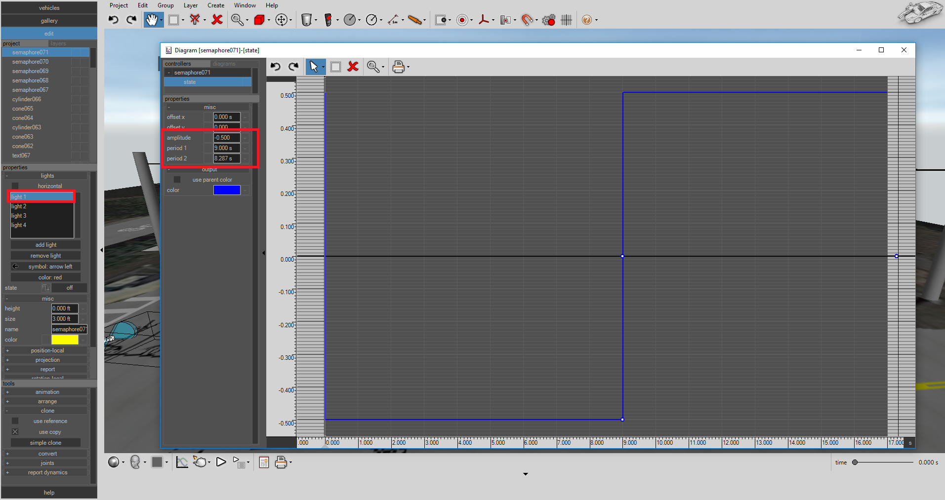 You’ll see the semaphore object created with a standard three-light vertical arrangement. This is easily customized.
