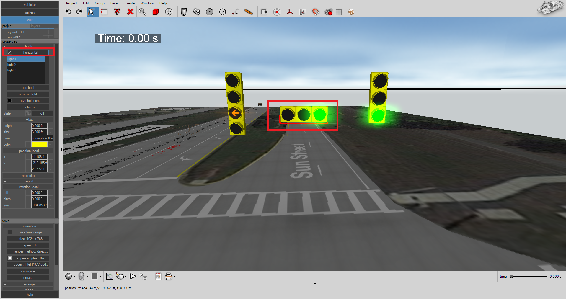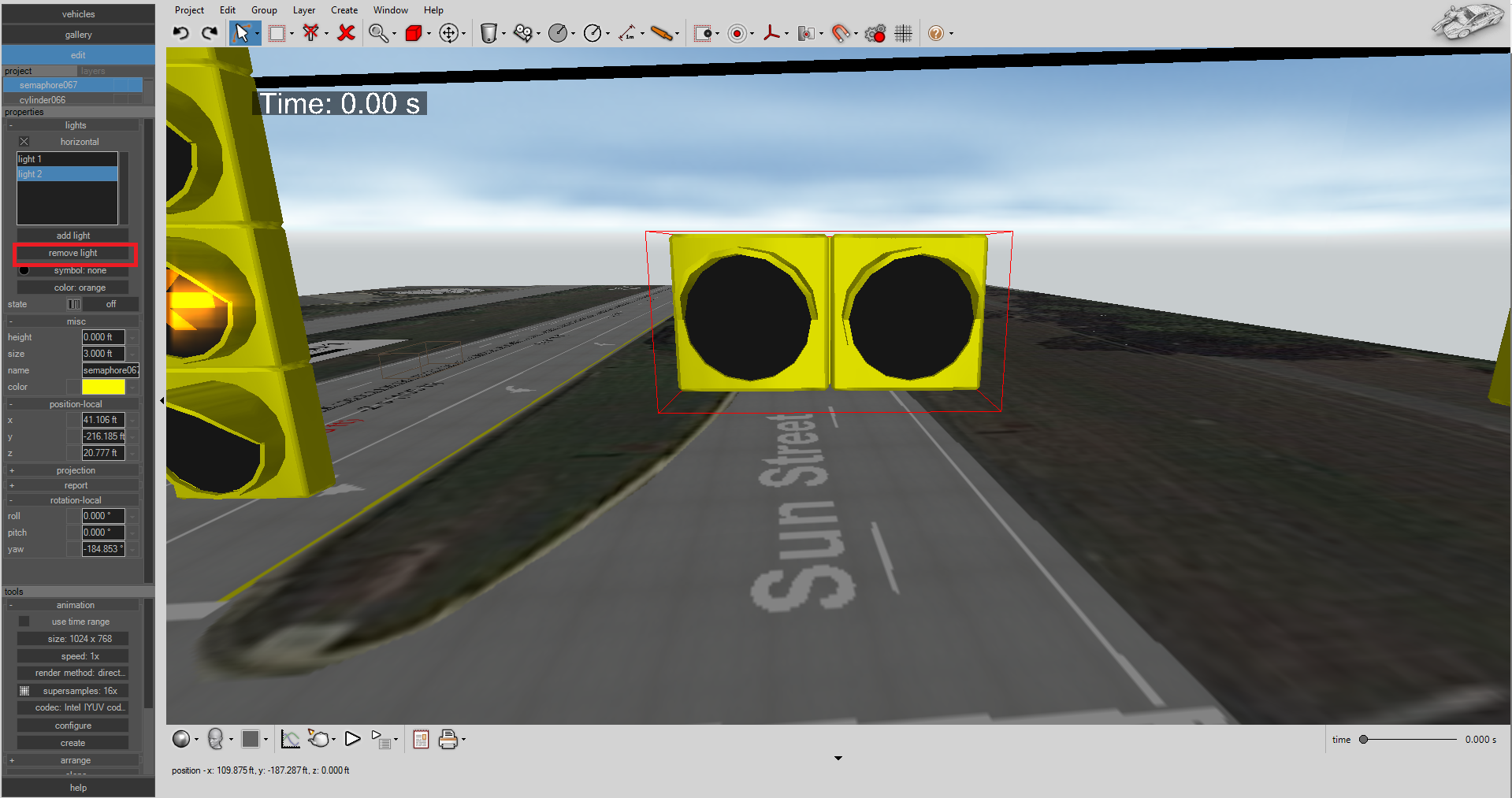 Next, we clone our light and position it for one of the left turn lanes. In the “lights” menu in the left-side control panel, left-clicking on “add light” will add another light to the bottom of the assembly.