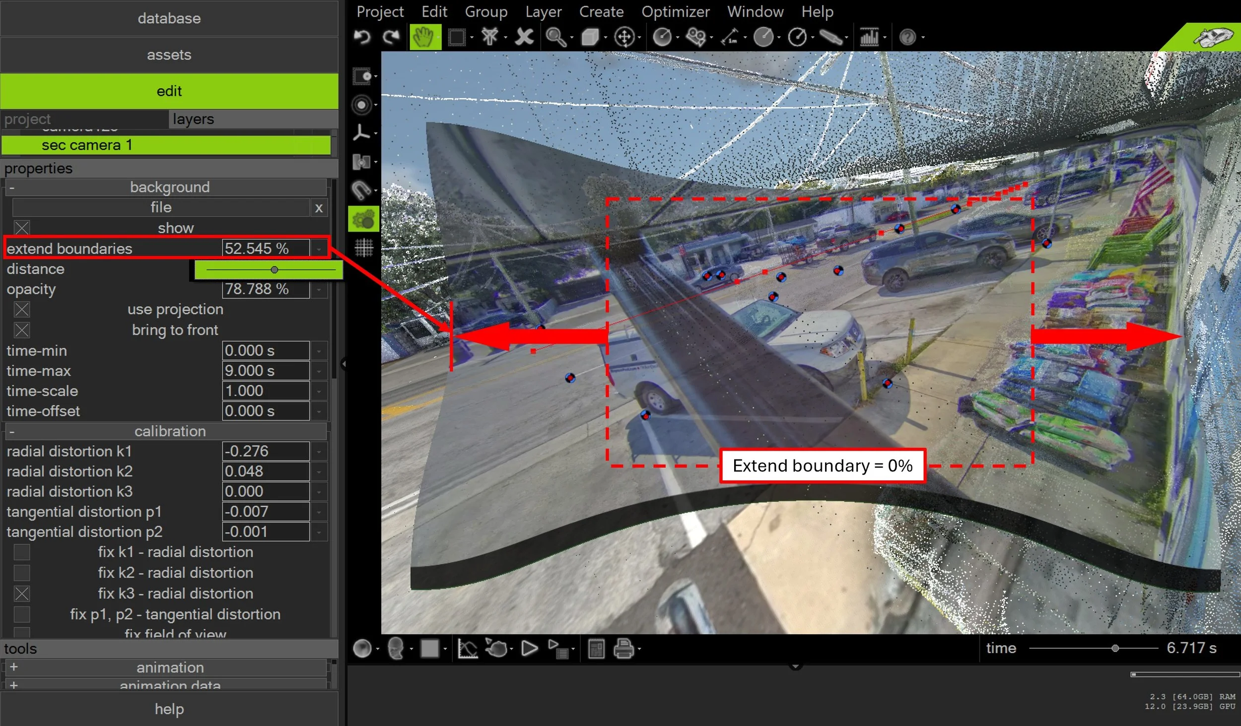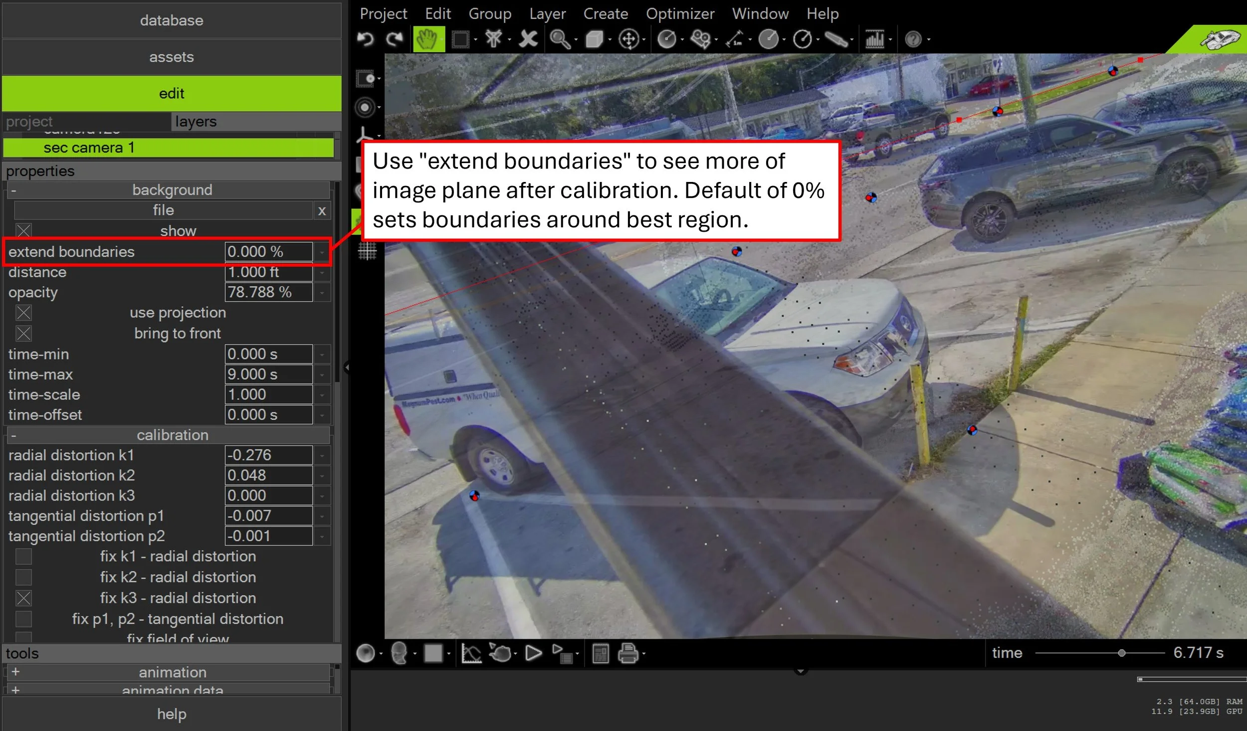 By default, when you calibrate your camera using the Easy Video and Image Analysis Tool, the image plane boundaries are set to show only the best region of the undistorted composition. This crops out areas where no pixel data exists after correction. To adjust this, go to the "Background" menu after calibrating your camera. Use "Extend Boundaries" to reveal more of the original image or video, including edge regions that may appear black or incomplete.