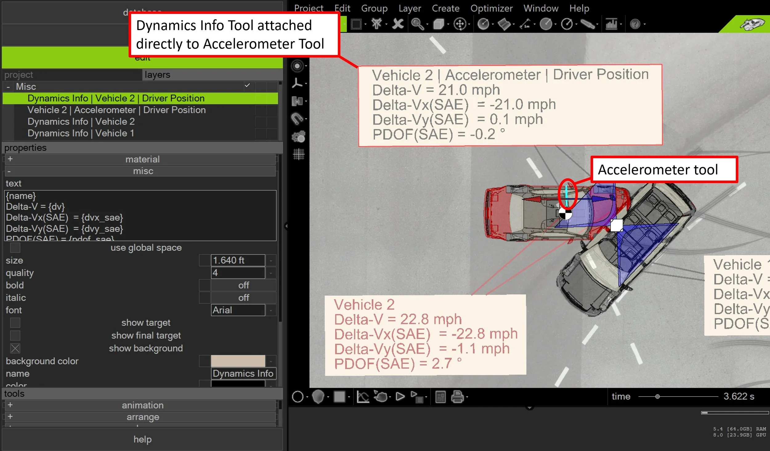 Both the Dynamics Info Tool (learn more) and the On-Screen Dynamics Info Tool (learn more) can be linked to the Accelerometer Tool to monitor behavior at specific locations within the vehicle frame. The accelerometer-linked Dynamics Info Tool can also be used to estimate cumulative Delta-V vector quantities with in a user-specified time interval.