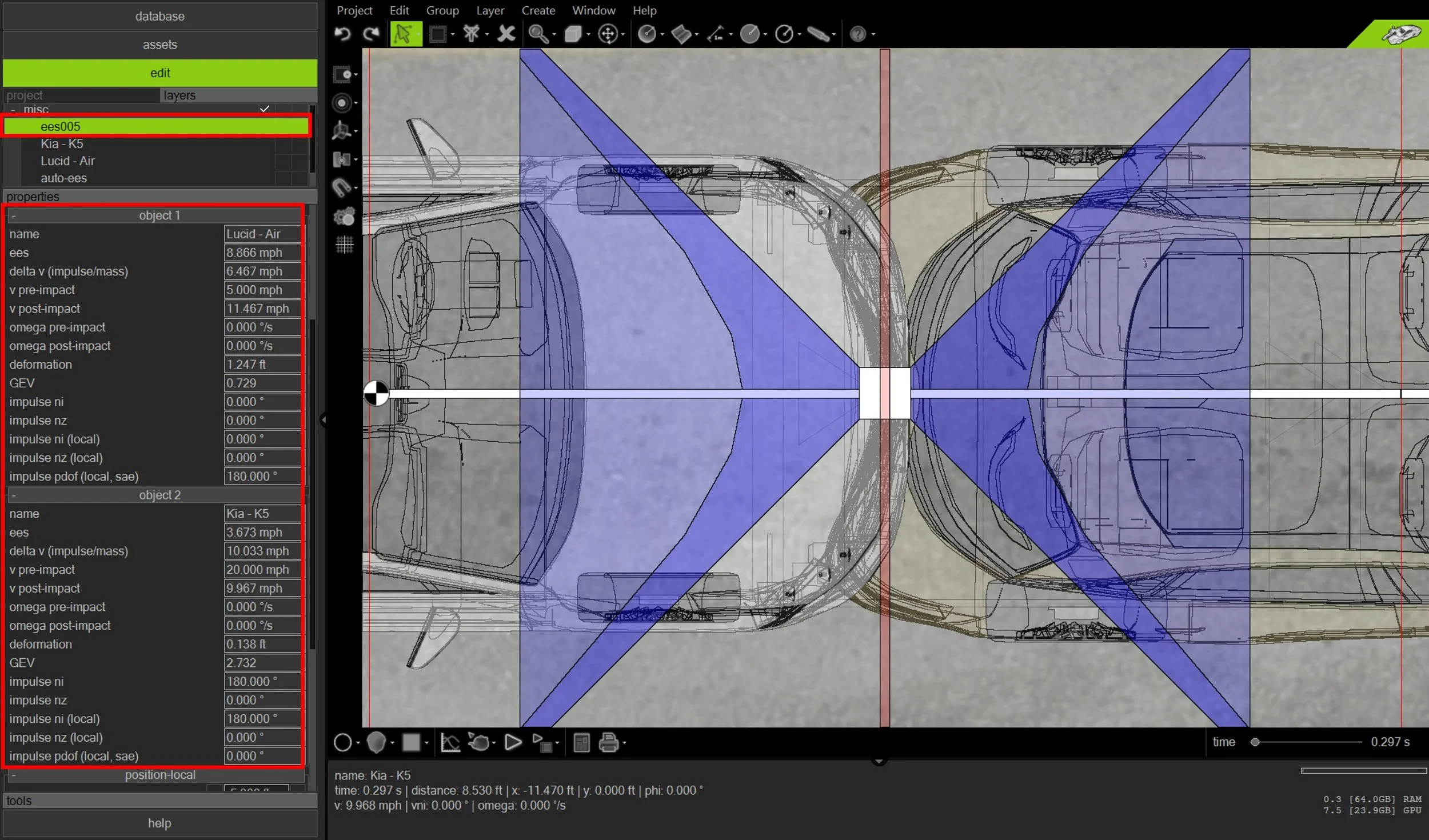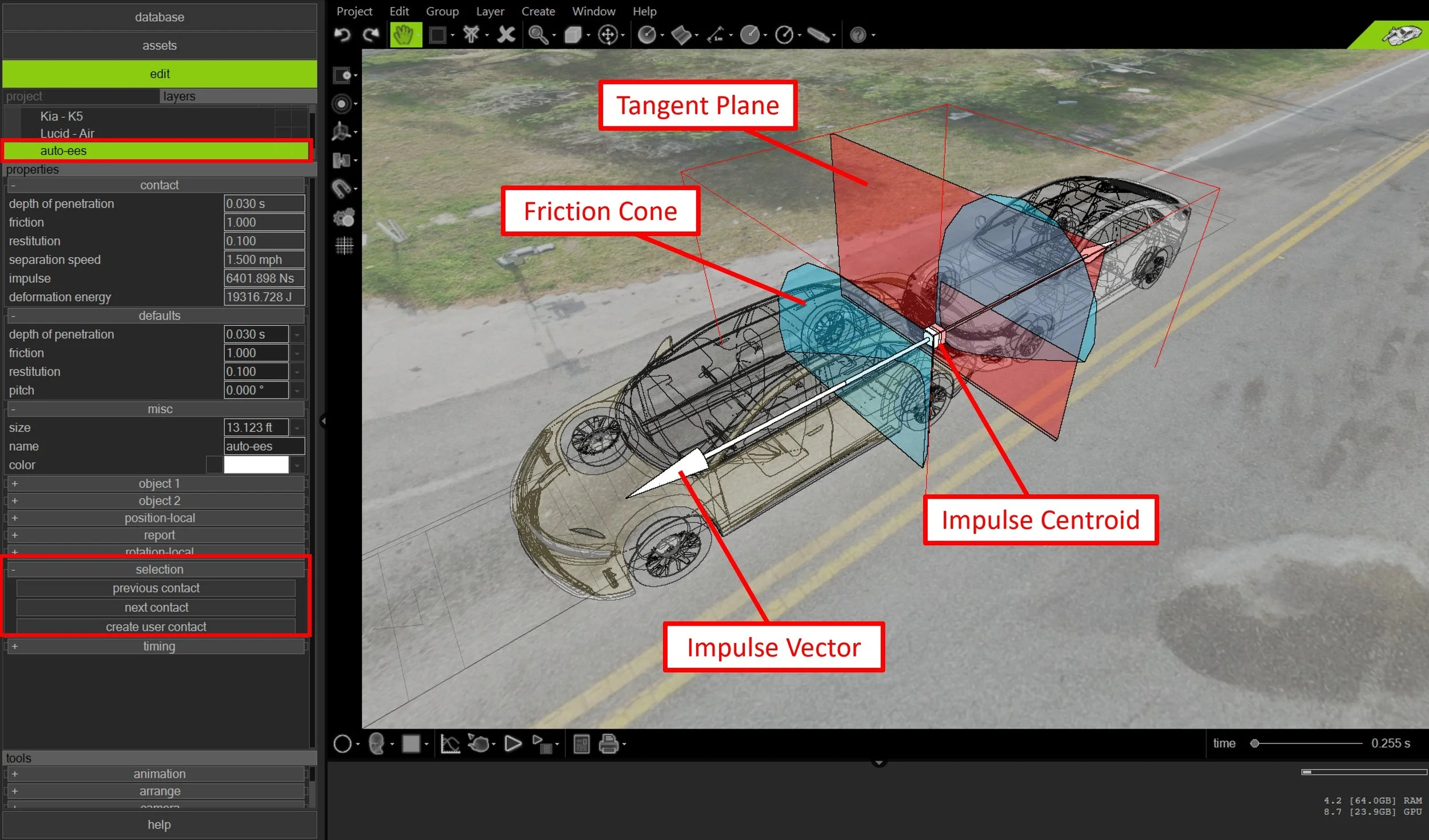 Next, open the “defaults,” “misc,” and “selection” menus to display various auto-ees features. In the “selection” menu, left-click “previous contact” to select the impulse exchange. If the contact interaction between the vehicles required more than one impulse exchange to resolve, you can cycle through each exchange by using the “next contact” button. Below we used [Ctrl+1] to switch our display to Contours view mode.