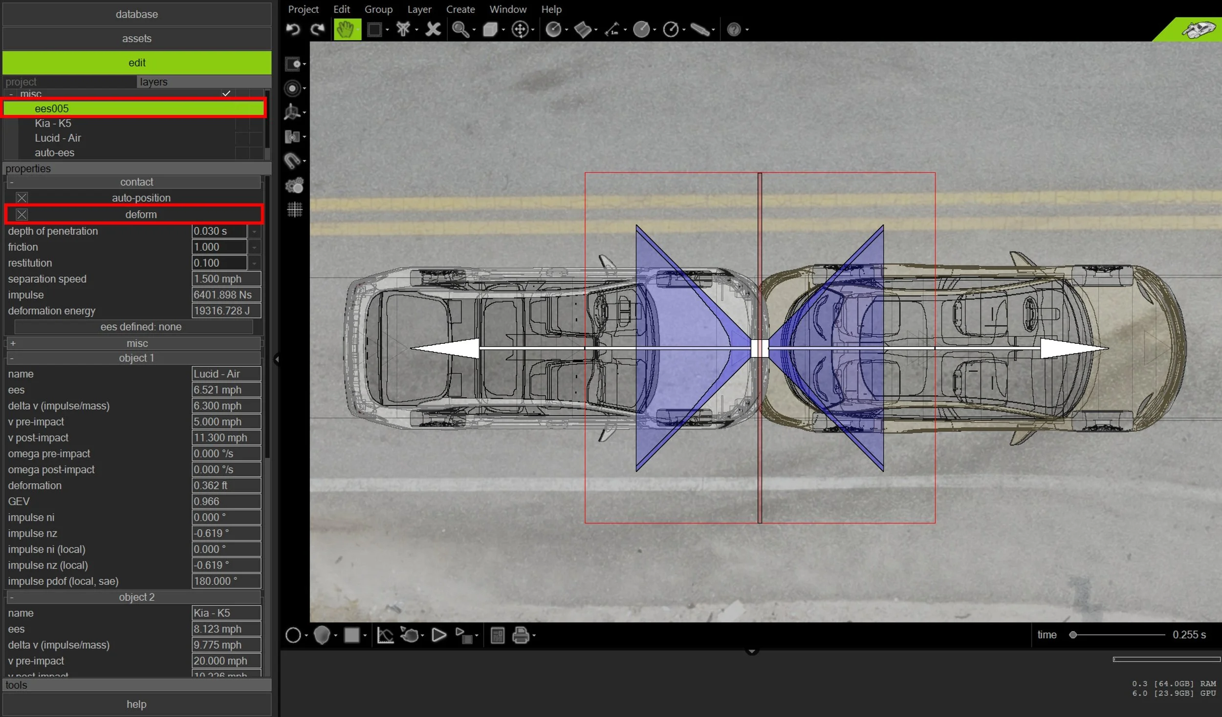 The deformation value for a given vehicle is determined by the distance between the vehicle’s bounding box and the impulse centroid position, measured along the normal collision axis. This distance is generally influenced by the depth of penetration time as well as the pre-impact orientations and positions of the vehicles. In our example, the auto-position feature of the ees object was disabled so that the centroid could be moved further into the Lucid’s rear. As a result, the Lucid shows a larger deformation value compared to the Kia. In typical cases, the impulse centroid and corresponding deformation estimates will be based on known crush profiles of the subject vehicles involved.