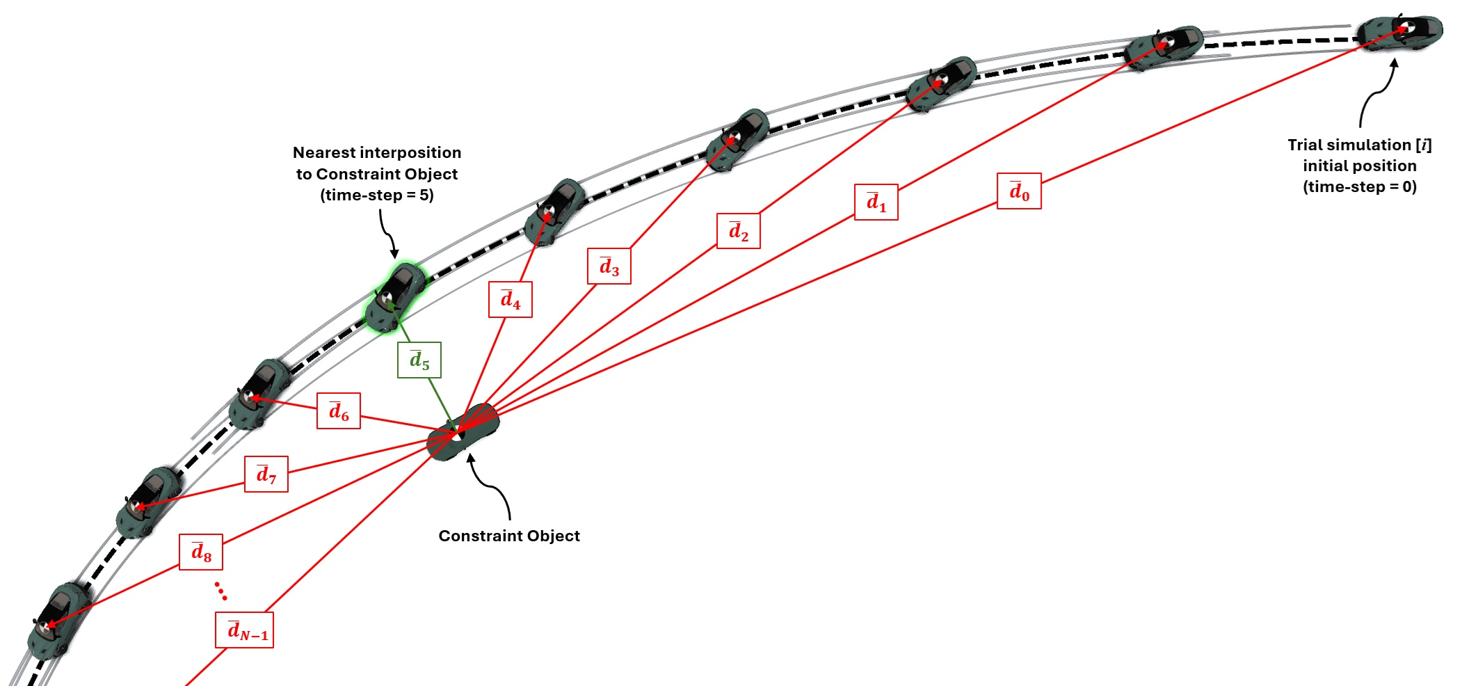 For each position/orientation constraint object created for a given parent, Virtual CRASH evaluates all time-steps during each optimization iteration to identify the time-step that yields the minimum distance to the constraint object. This process is illustrated below for trial simulation \(i\), where the displacement vector from the constraint object to the vehicle position is computed at each integration time-step. Each displacement vector is indexed by time-step number (here the time-step size is exaggerated for illustration purposes). For this trial simulation, the position, orientation, and speed values are sampled from time-step 5 to evaluate the corresponding deviation for trial \(i\).