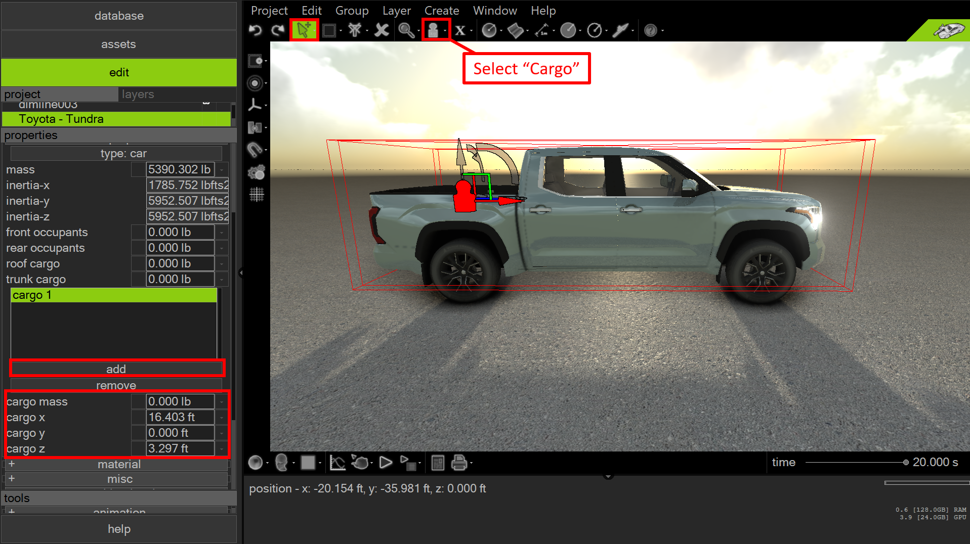 To adjust cargo placement interactively, select the “cargo” option from the object selection dropdown menu, use the select and move tool ([F2]), and manipulate the gizmo (press [1] at the top of the keyboard). By default, the cargo object is positioned along the vehicle’s x-axis at the forward-most point of the vehicle, with a height equal to the ground clearance.