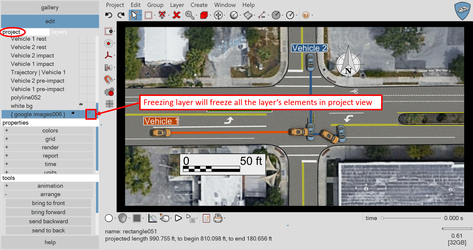 Groups can be quite useful in Virtual CRASH for Public Safety, but they do have two important limitations. First, you cannot add elements to or remove elements from an existing group. To add or subtract elements, you must Ungroup the current group, then regroup the new list of elements. Second, groups can only be composed of like objects. For example, you cannot group a 3D vehicle object with 2D graphical elements such as curves. Because of these limitations, it may be more desirable to arrange your project’s assets using layers.