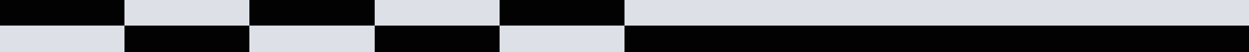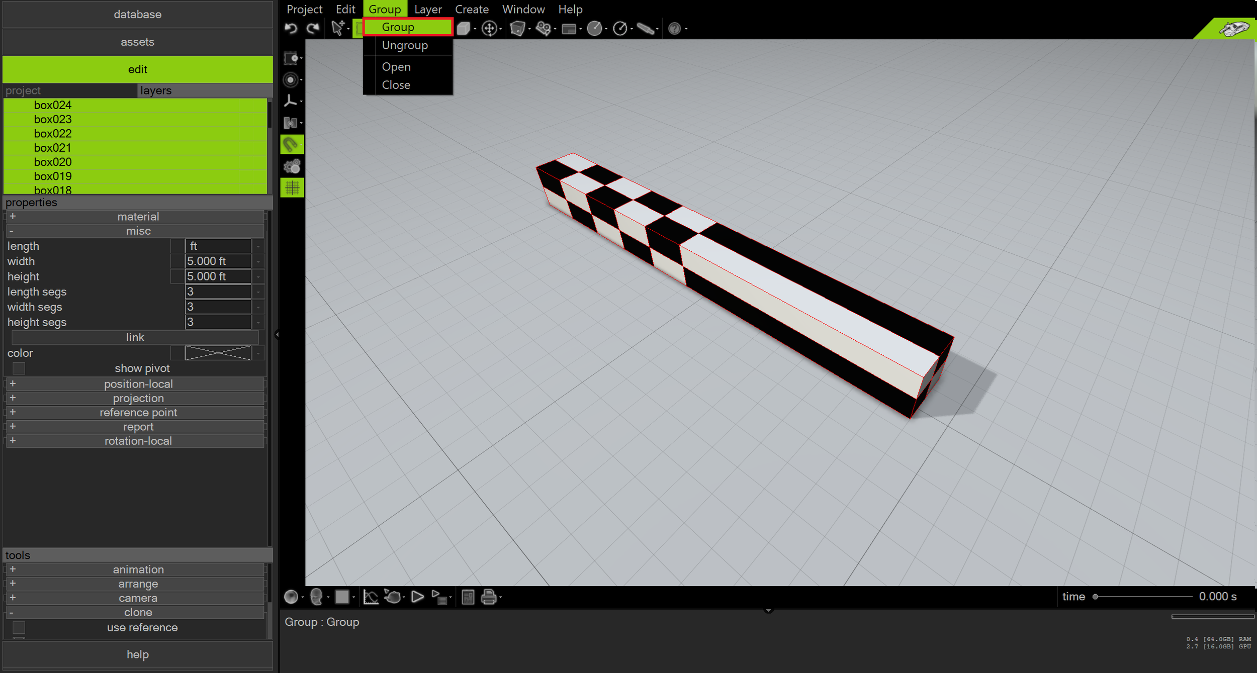 First, create an arrangement of box objects with alternating black and white colors. Use grid point snapping to easily arrange the boxes at regular intervals. Below, we show five boxes, each with a length of 10 ft, arranged next to one box with a length of 25 ft. Four such arrangements are created by cloning and then positioned as shown below.