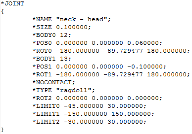 Obviously, the head is connected to the neck segment ellipsoid. Scrolling further down the mbdef file, we find the joint block: