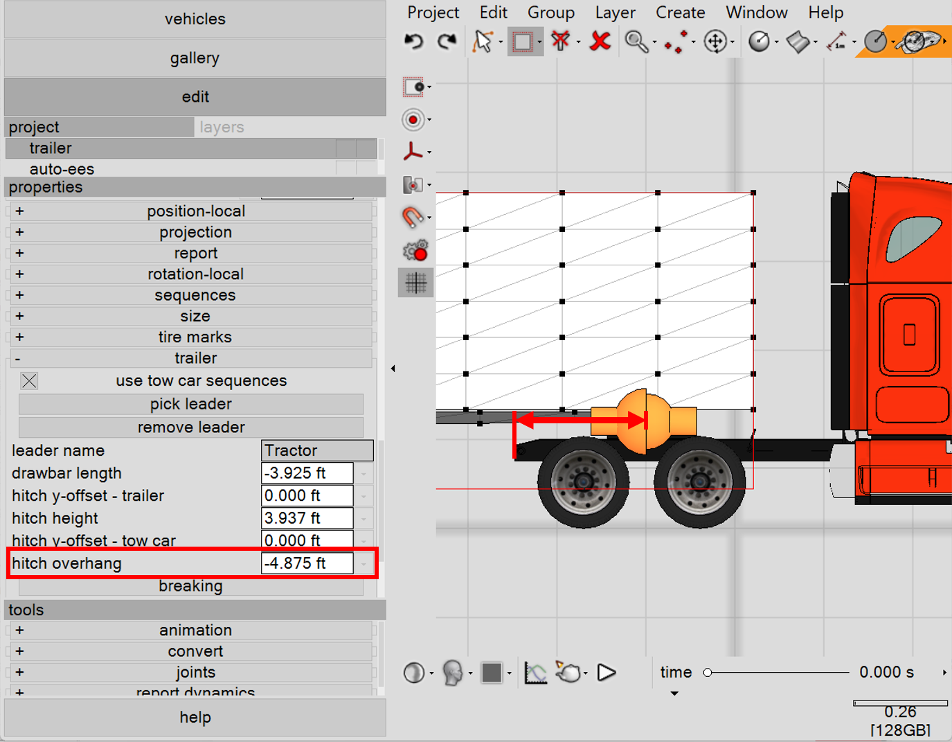 In Virtual CRASH, hitch overhang is defined as the distance between the hitch joint and the rear-most vertex of the leader vehicle model geometry. Negative values will slide the joint forward of the leader vehicle’s rear-most vertex. Positive values will slide the joint backward of the leader vehicle’s rear-most vertex. Note, as the joint slides forward or backward with changing hitch overhang values, the trailer remains at a fixed position relative to the joint.