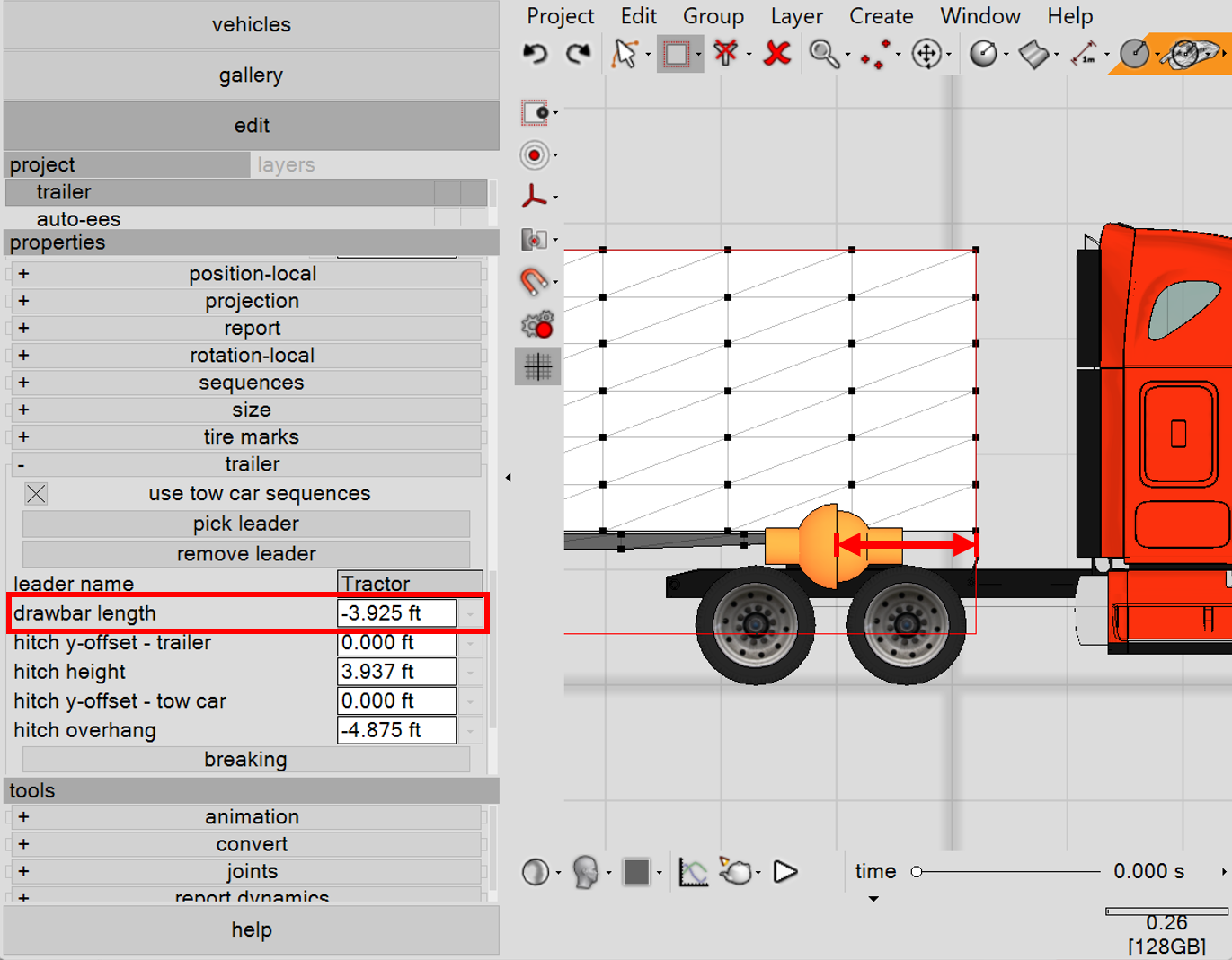 In Virtual CRASH, drawbar length is defined as the distance between the hitch joint and the forward-most vertex of the trailer model geometry. Negative values will slide the trailer geometry forward of the joint. Positive values will slide the trailer backward of the joint.