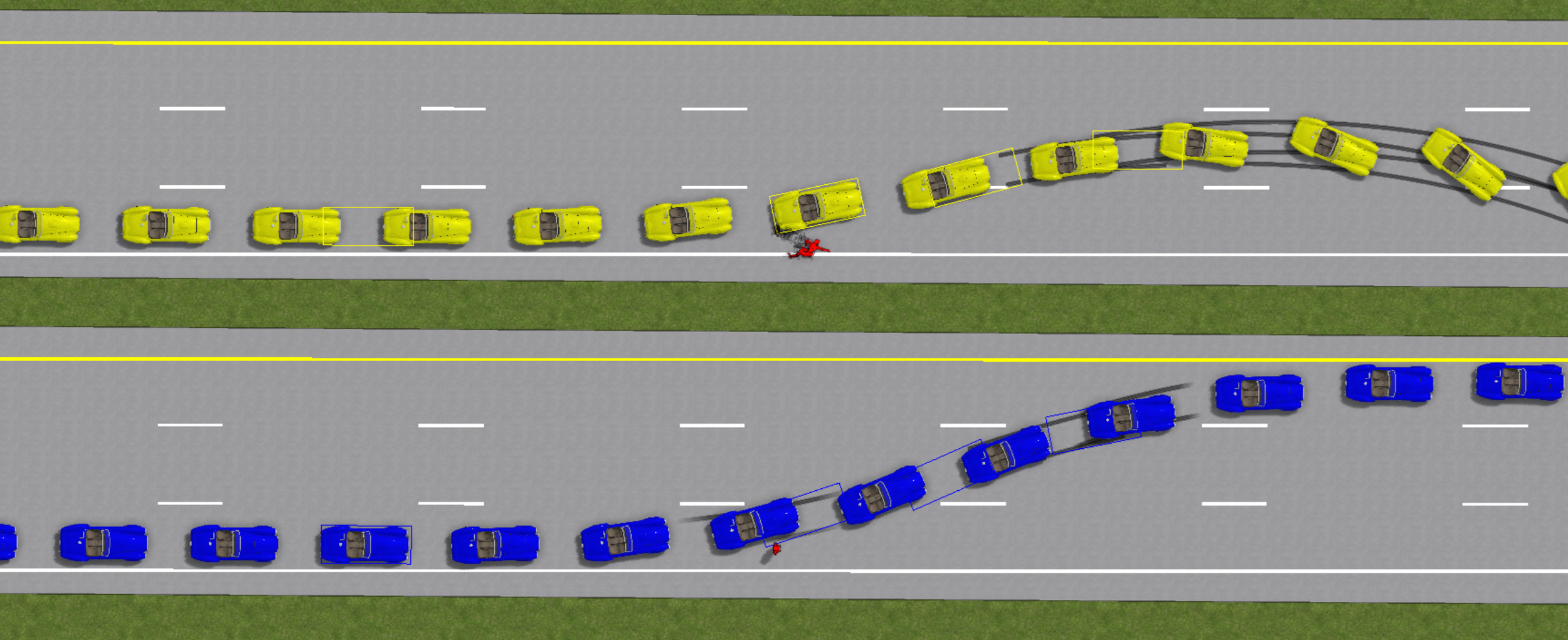 By manually programming braking ratios by wheel, you can model other ESP algorithms, including ones which correct for understeer based on yaw-rate and/or steering input thresholds of your choice. In the image below, both vehicles attempt an avoidance maneuver around the red multibody. The yellow vehicle’s sequence only includes steering inputs, while the blue vehicle includes steering inputs along with a braking ratio applied to the inside rear wheel to correct understeer, followed by a braking ratio applied to the outside front wheel to correct oversteer.