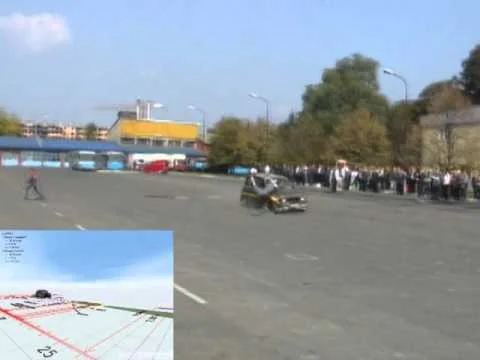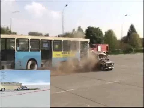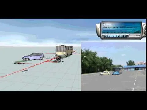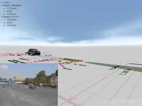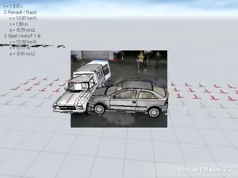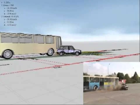 Here we see an example of Virtual CRASH 2.2 used to reconstruct real world collision between a station wagon and a motorcycle. The accident was captured on video. Excellent agreement is observed between the video and simulation (courtesy of engineer Sarkozi Tamas of Hungary).