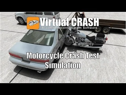 The Virtual CRASH family of physics simulators comes with the unique ability to quickly simulate collisions involving motorcycles. Below we show a series of Virtual CRASH 2.2 simulation tests based on staged experiments presented in SAE 2002-01-0551.